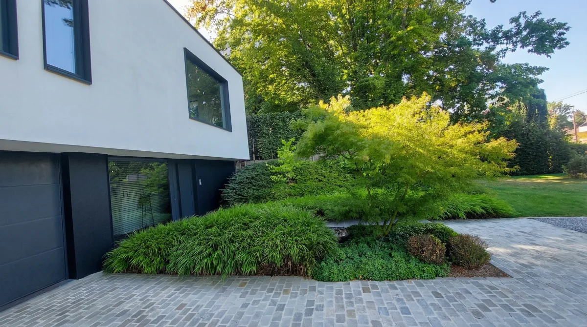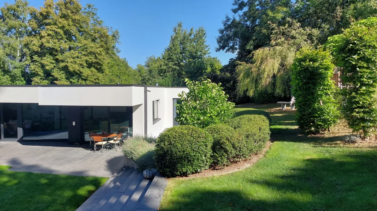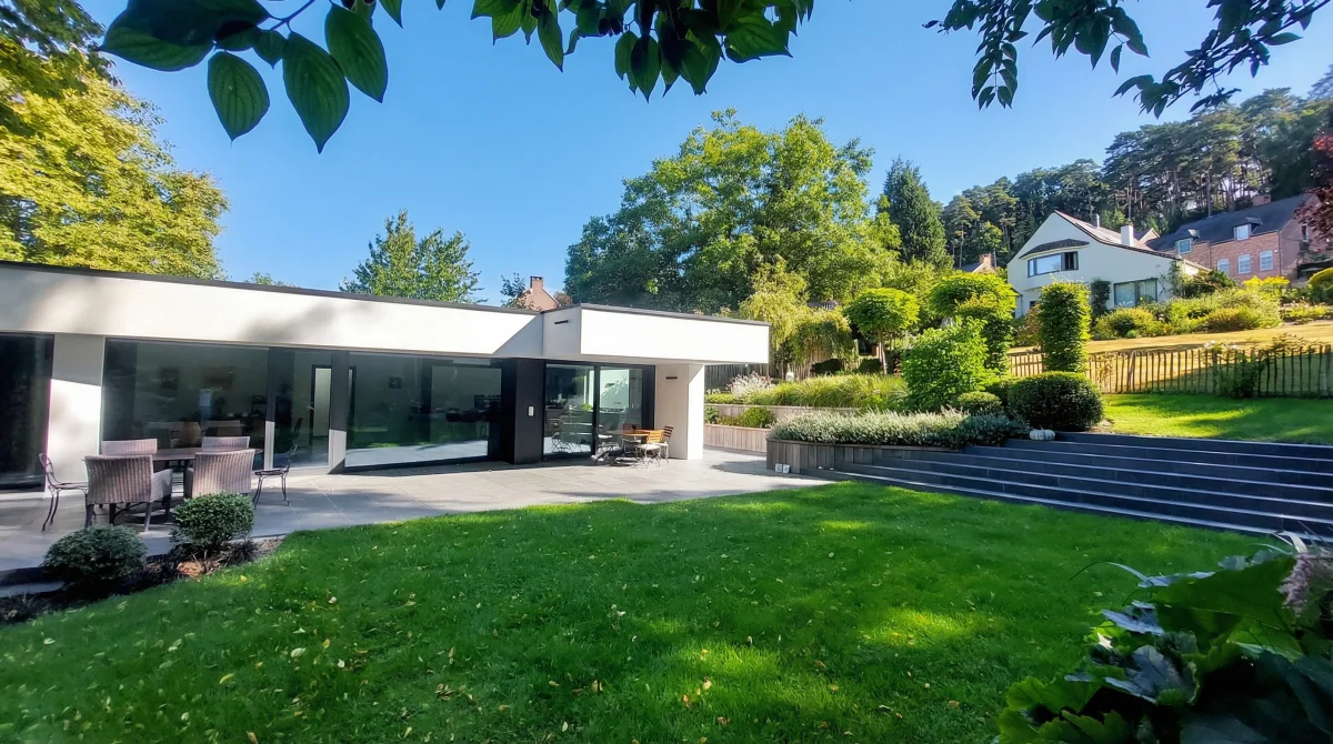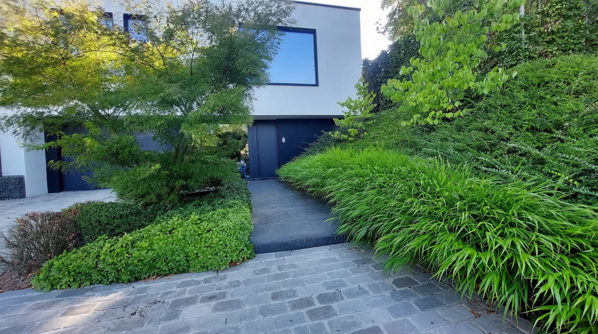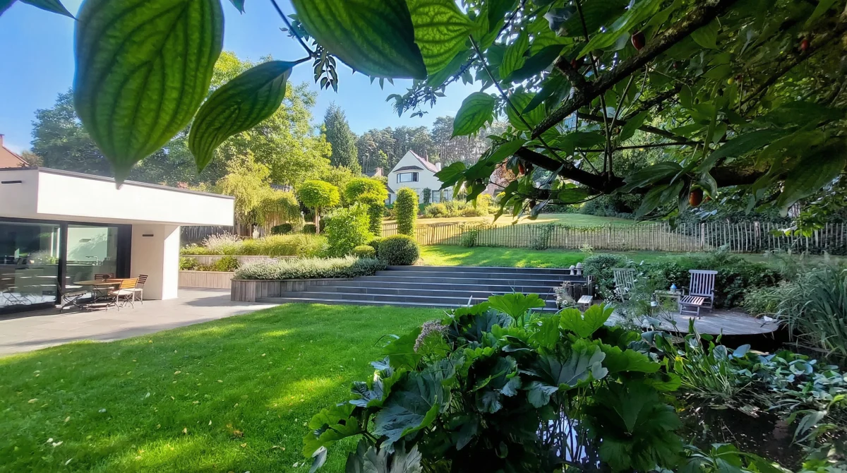 Ici, nous sommes partis d'un terrain en pente, relativement restreint. Notre mission : agrandir visuellement l'espace, structurer le terrain et le rendre plus fonctionnel.