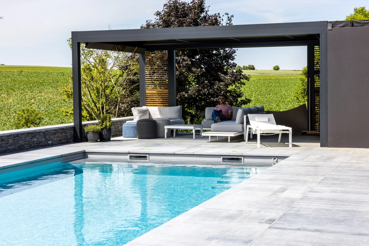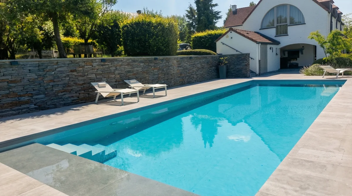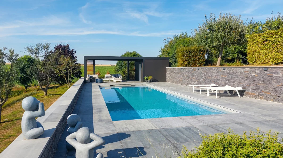 Ici, la piscine s'intègre au cœur d'un talus très pentu — une véritable prouesse technique qui donne enfin sens à un espace jusque-là inutilisé.