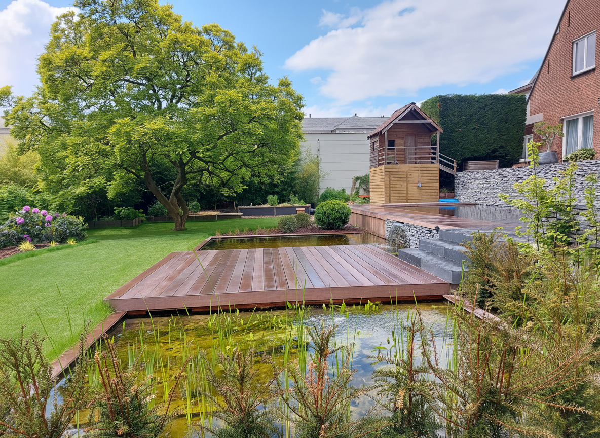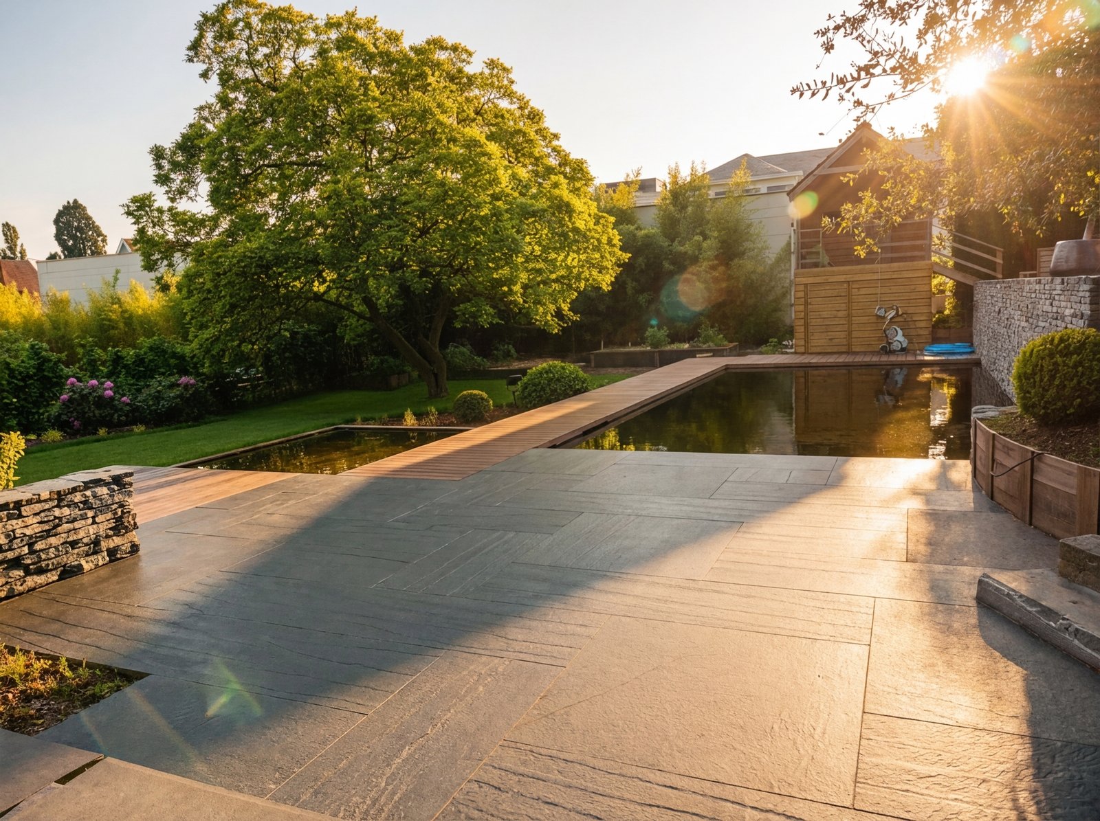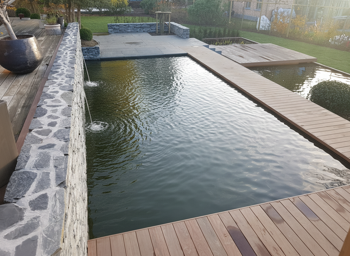 Le mur en pierre sèche structure l'arrière-plan et ancre la composition dans le paysage. La terrasse en azobé apporte la chaleur du bois exotique. Pierre brute, bois huilé, eau claire : ce dialogue entre matériaux donne au jardin son caractère affirmé.