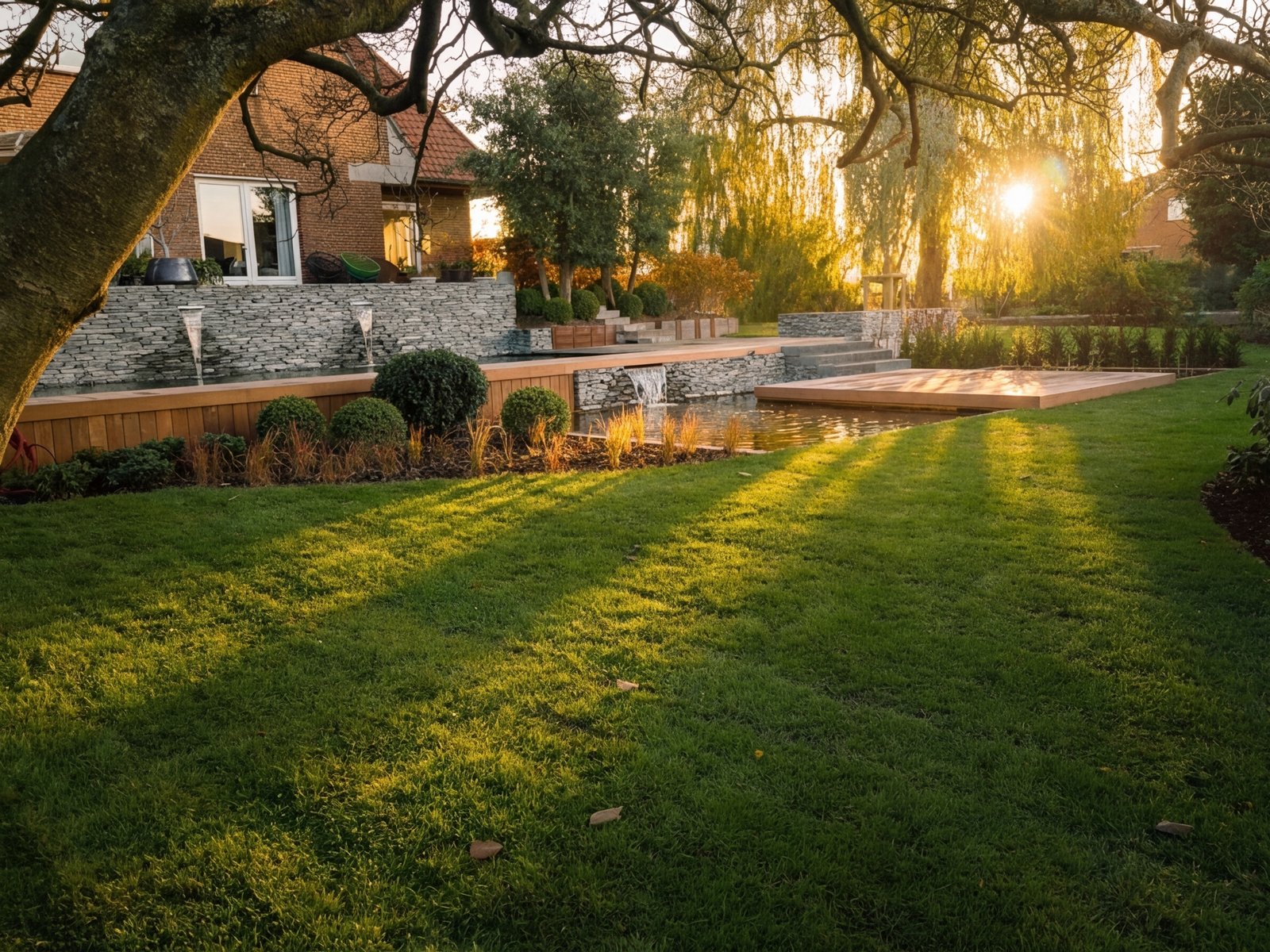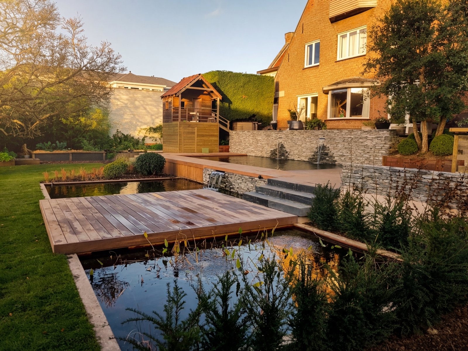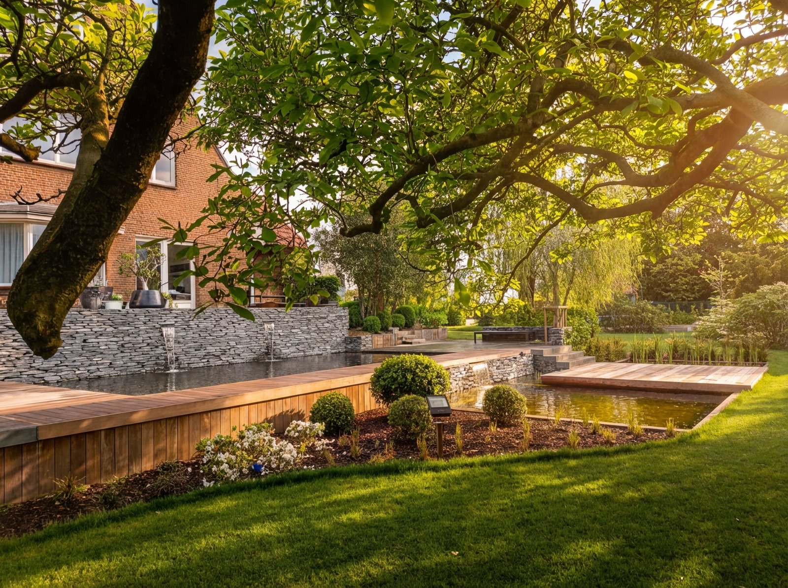 Le mur en pierre sèche structure l'arrière-plan et ancre la composition dans le paysage. La terrasse en azobé apporte la chaleur du bois exotique. Pierre brute, bois huilé, eau claire : ce dialogue entre matériaux donne au jardin son caractère affirmé.