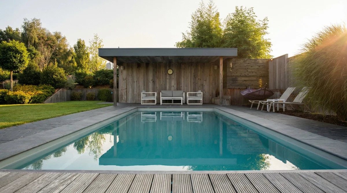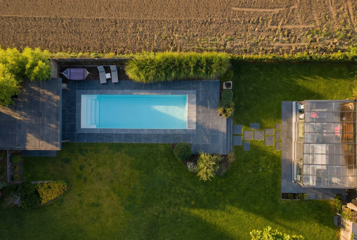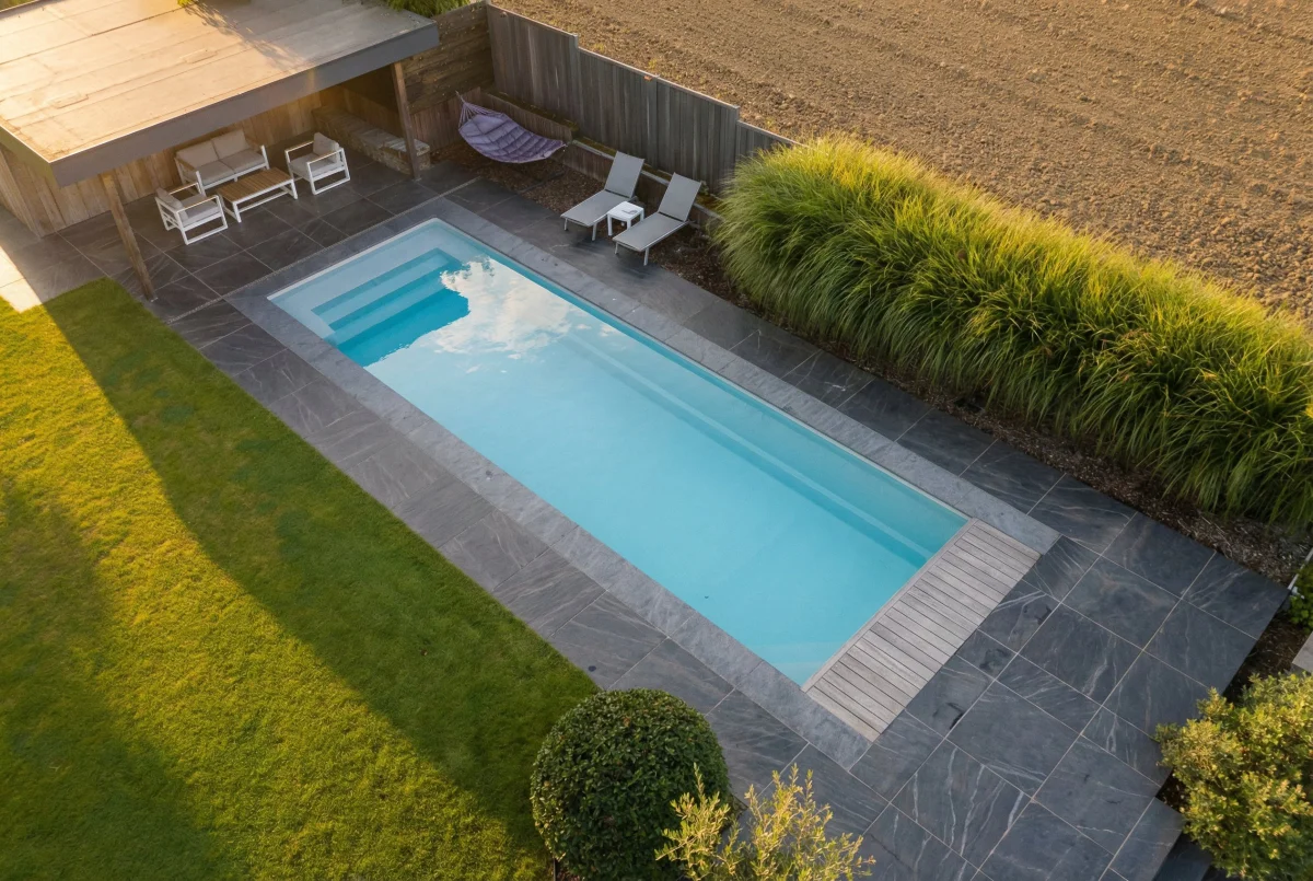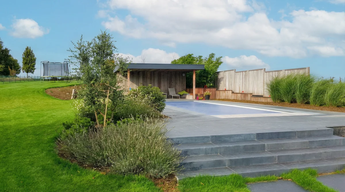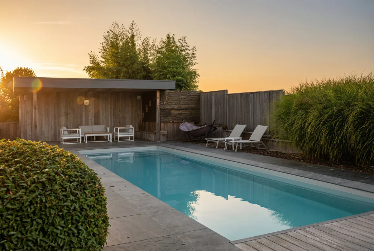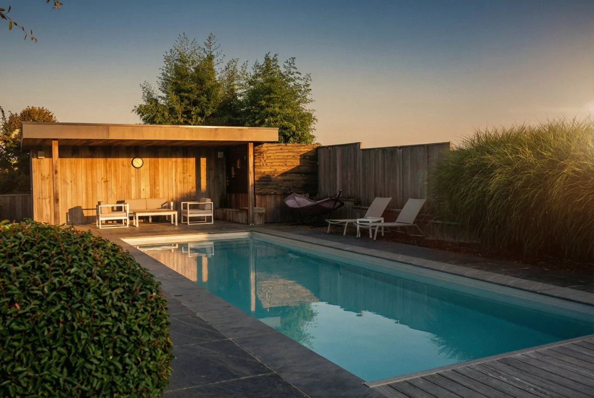 Ce projet s'articule autour d'un coin piscine élégant et confortable, véritable pièce maîtresse du jardin. Pensée comme un lieu de détente à part entière, elle attire naturellement le regard et donne une direction claire à l'aménagement, transformant l'espace en un cocon accueillant.