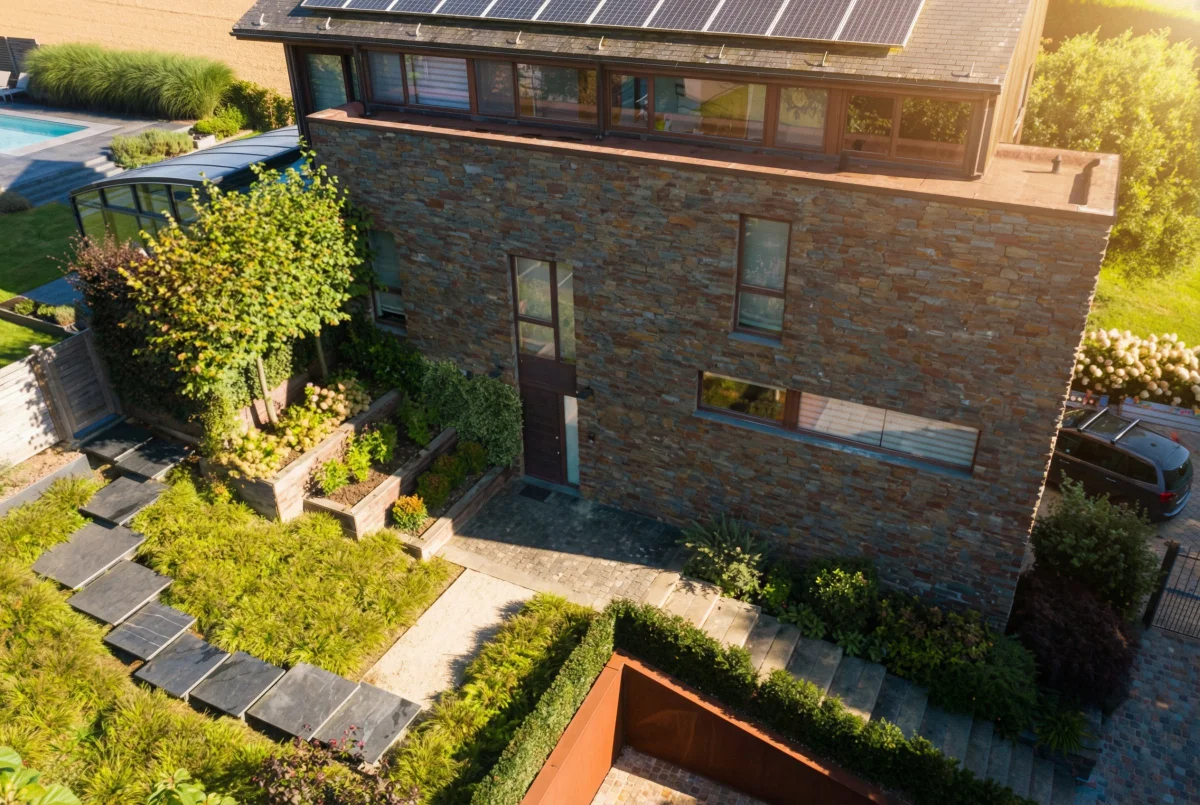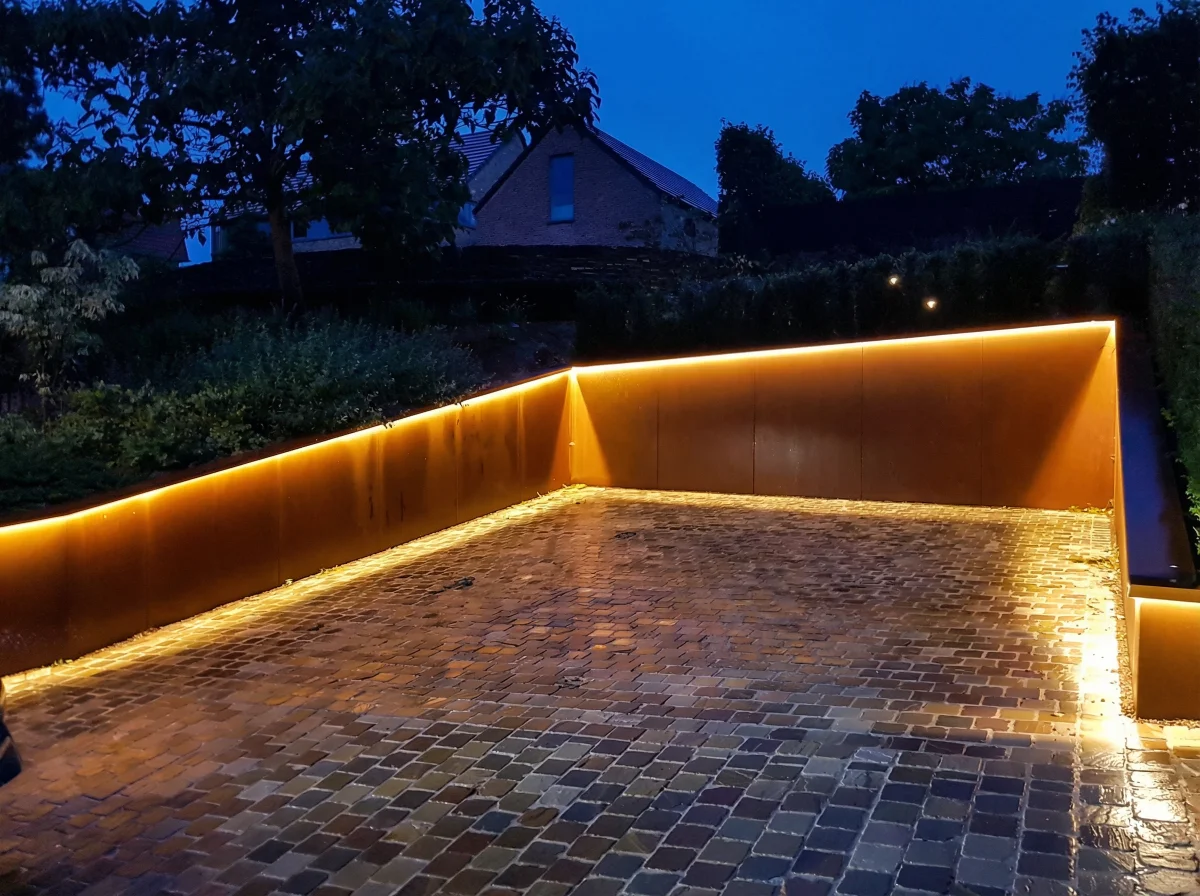 En devanture, le parking est structuré par des murs de soutènement en acier corten, dont la teinte chaleureuse renforce le caractère résolument moderne et contemporain du projet. L'éclairage intégré sublime l'ensemble en soirée, révélant les volumes et apportant une touche chic et sophistiquée.